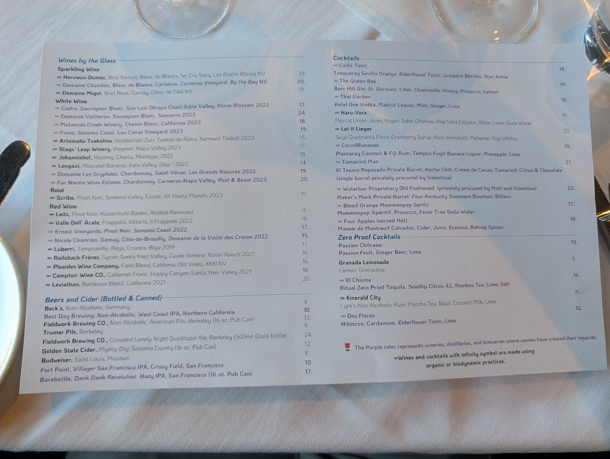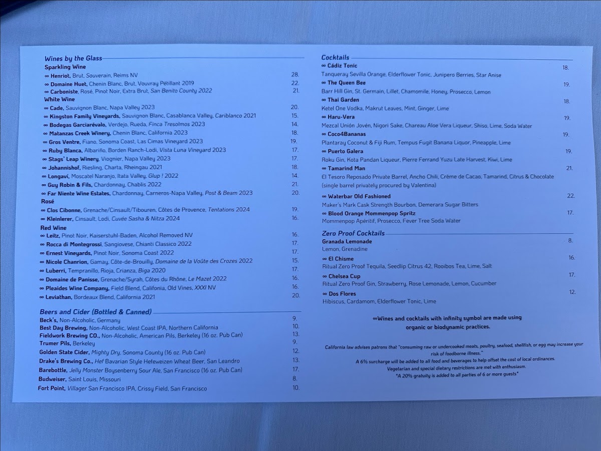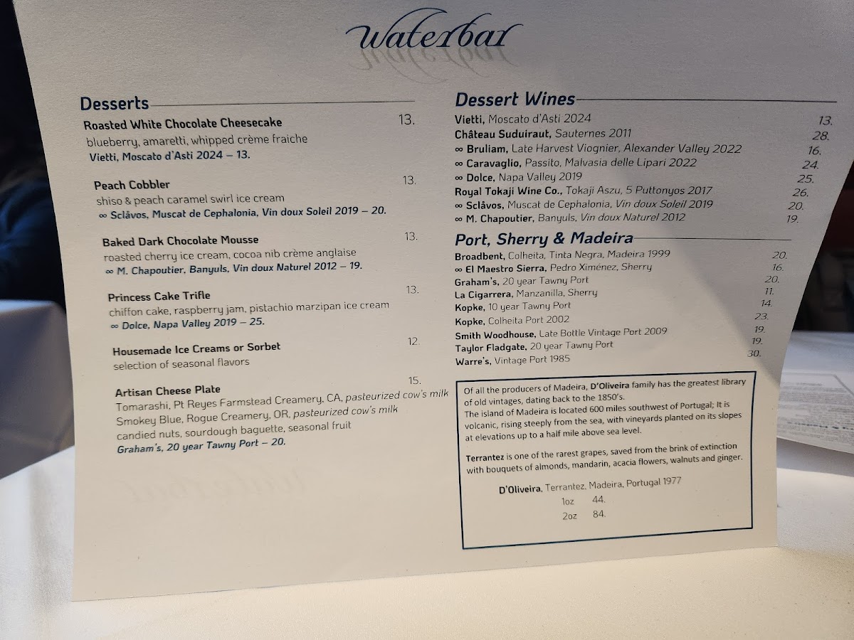 The menu at Waterbar offers a refined selection centered around fresh, seasonal seafood with an emphasis on both taste and presentation. You’ll find thoughtfully prepared entrées like oven-roasted black cod with forbidden fried rice and ahi tuna paired with truffle glace—dishes that suit an elegant yet relaxed dining experience.