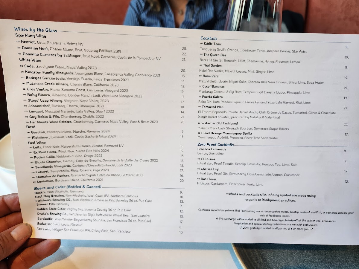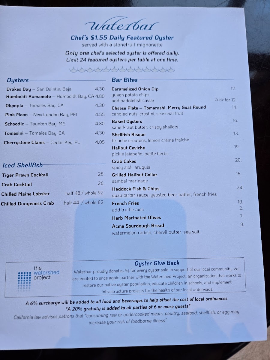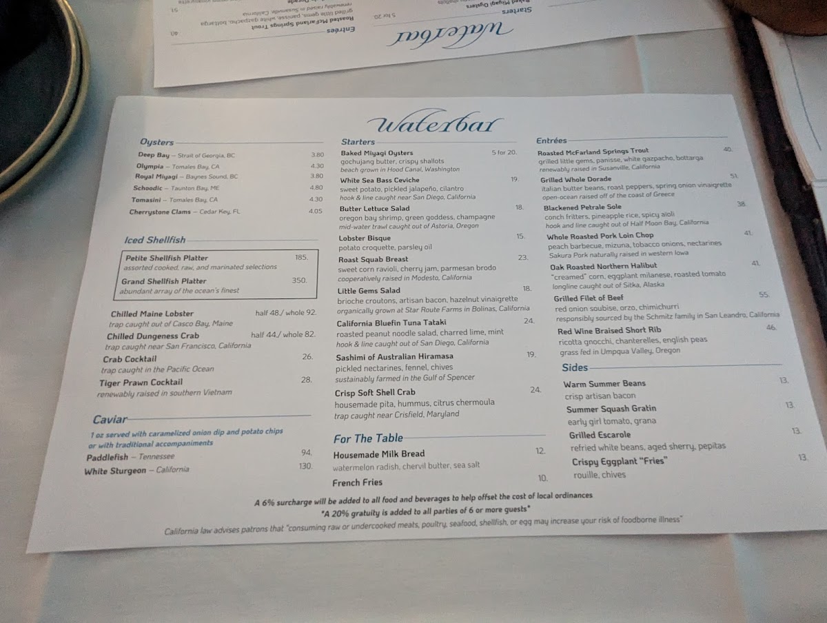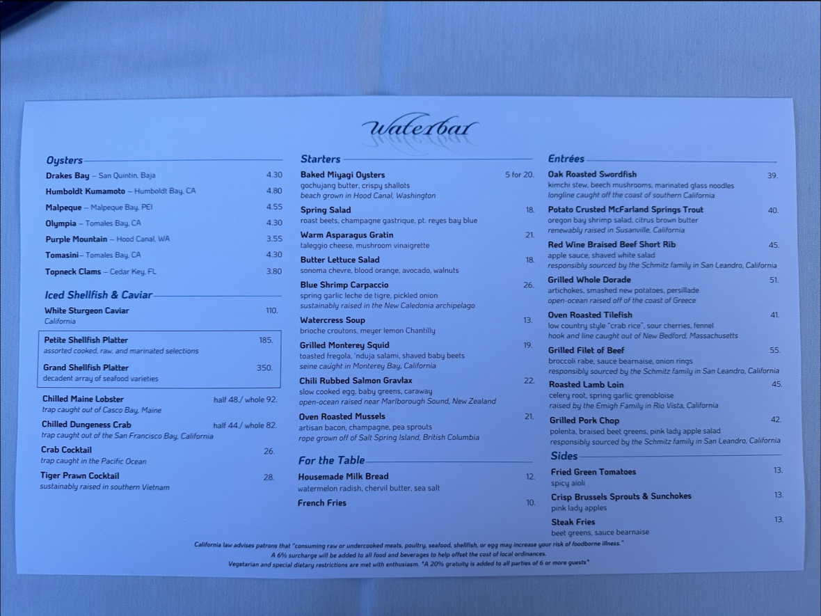 Waterbar Restaurant Menu